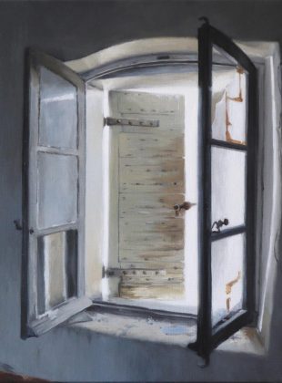 Katy Serra, « La maison du Faubourg, la fenêtre du 2ème », 40x40cm, huile sur toile