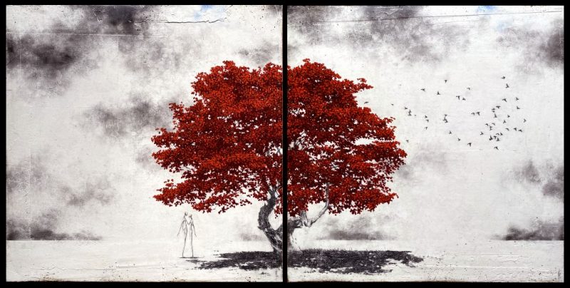 Le tout est recouvert d’un vernis épais pour fixer à jamais cette nature désinvolte et poétique, dont les arbres majestueux arborent fièrement leurs nez rouges, comme une insolence envers une réalité morose.