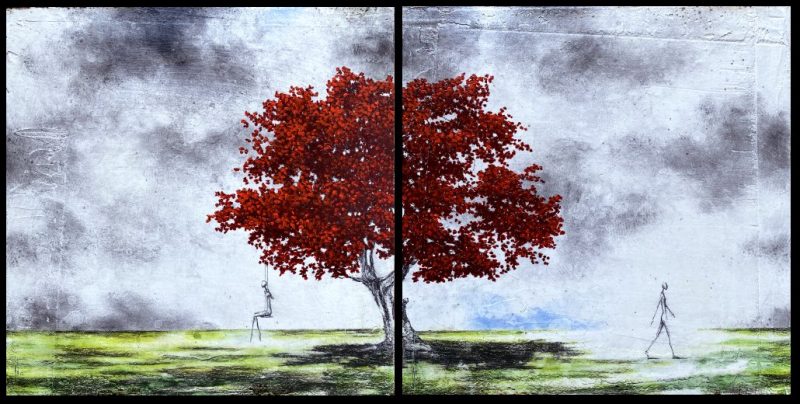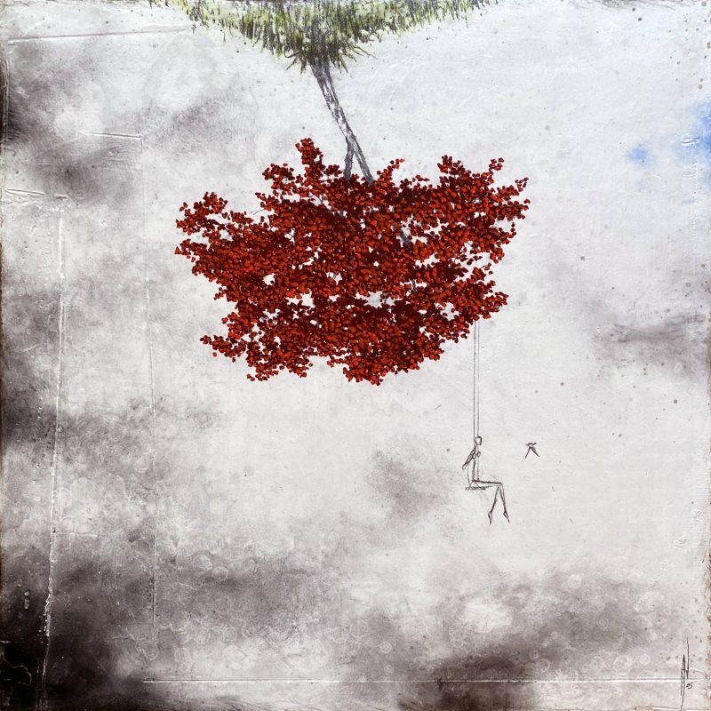 Sa technique est singulière car il fait intervenir plusieurs médiums à la fois : il travaille sur du bois enduit, dessine ensuite à la mine de plomb, au critérium et à l’encre pour les traits délicats, les détails. Puis, vient le pastel pour les ciels, et l’acrylique pour les feuilles de ses arbres d’un rouge écarlate, presque gourmand.