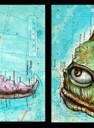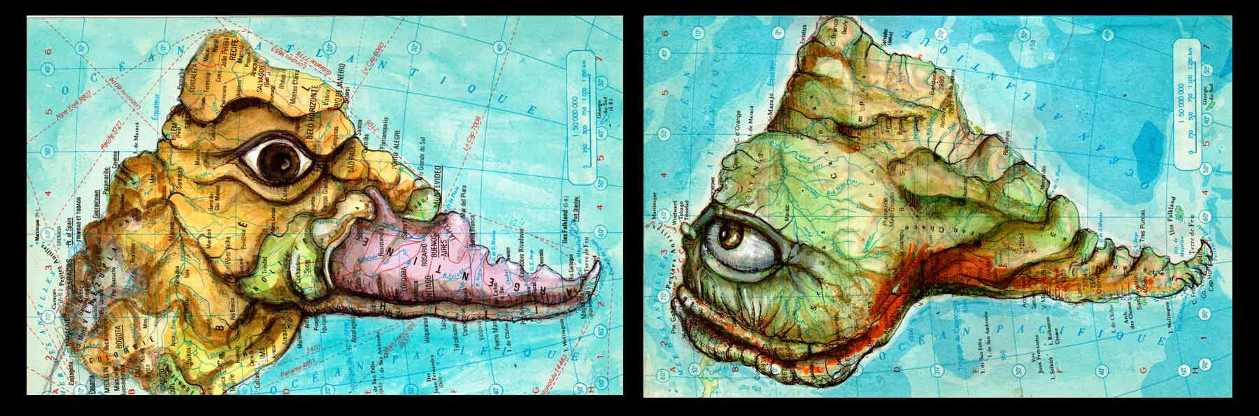 Marcoleptique, « canard vs tétard », 2x24x18cm, dessin sur carte géographique de 1980
