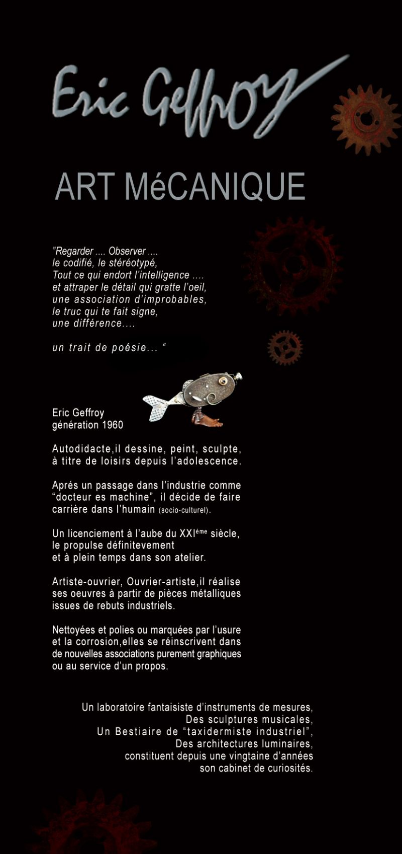 Véritable « Géo Trouvetou », Eric GEFFROY prolonge la vie des vieux objets en leur faisant raconter une autre histoire que petits et grands peuvent s’approprier. C’est un artiste inclassable dont la tête fourmille d’idées et dont l’humour est presque poétique.