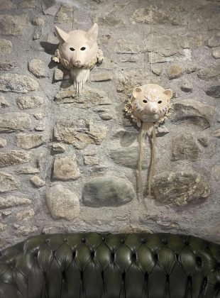 Lara Blanchard, grands ornements muraux en céramique émaillée, l’ours et le loup, 30cm de diamètre