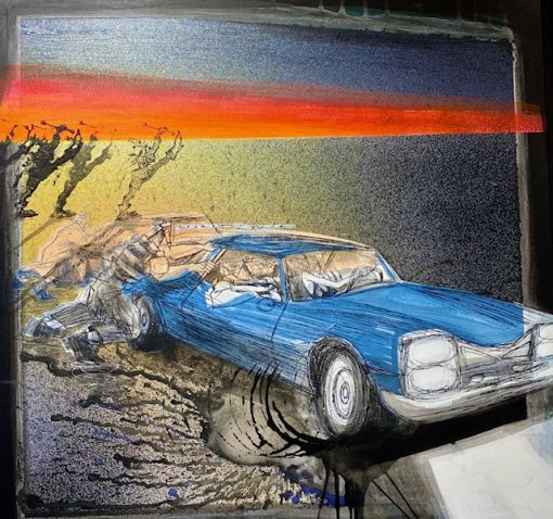 L’incommunicabilité entre les êtres, la fuite, la solitude, tous ces thèmes chers au film noir sont une source d’inspiration évidente. « J’aime l’idée de me saisir des codes qui sont propres au cinéma ». On retrouve alors des am-biances à la Jean-Pierre Melville, des grosses berlines noires qui traversent les villes, de nuit, sous la pluie, des gangsters à imperméables, des Doulos vissés sur la tête, des jazzmen langoureux et imperturbables, des femmes fa-tales à la chevelure indomptable, face au lac ou à la mer…. Sa peinture est ci-néphile, narrative. Certaines oeuvres sont composées à la façon des story-boards, truffées de symboles, de mots, d’indices et de codes à décrypter.