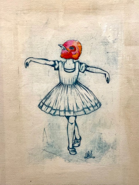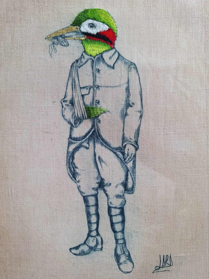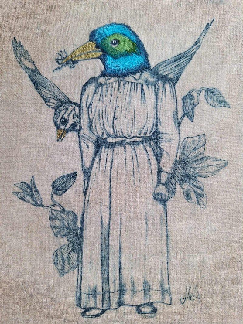 - L’oiselle aux bottines – Gravure à la pointe sèche imprimée sur coton teint au thè noir, brodée à la main + or véritable, 40x30cm