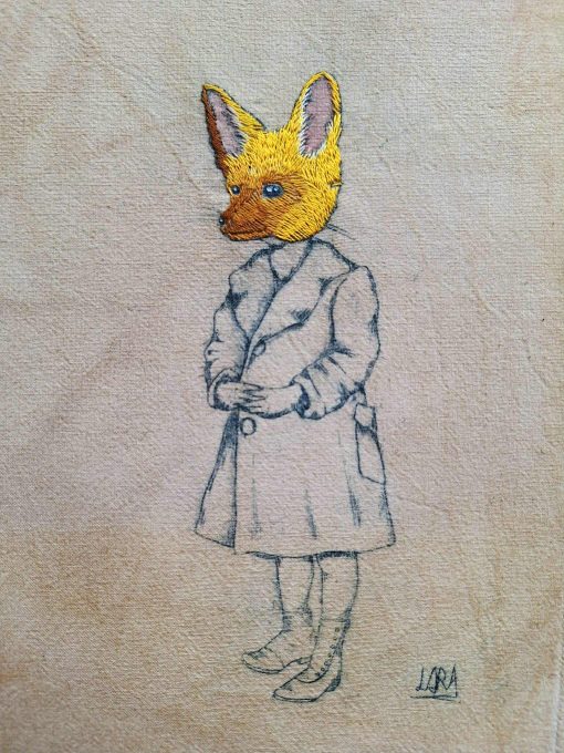 - La petite fennec – Gravure à la pointe sèche imprimée sur coton teint au thè noir, brodée à la main , 40x30cm
