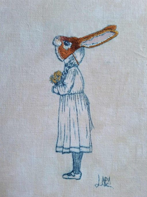 Délaissant le papier, elle choisit le textile comme support. Cela lui permet la mise en couleur par la broderie traditionnelle, à la main.