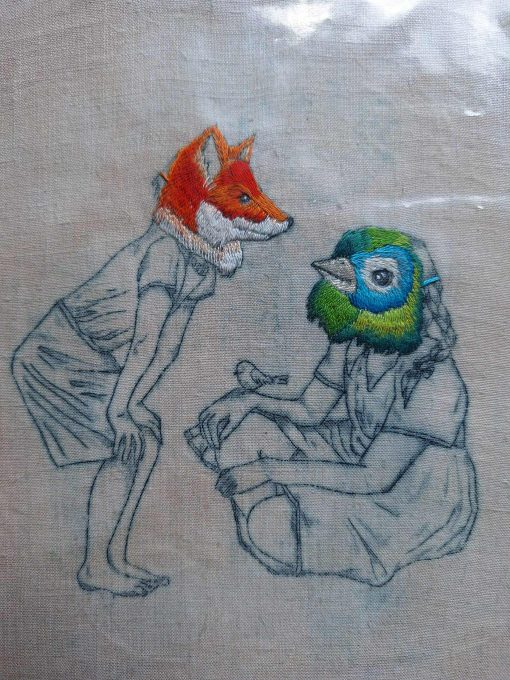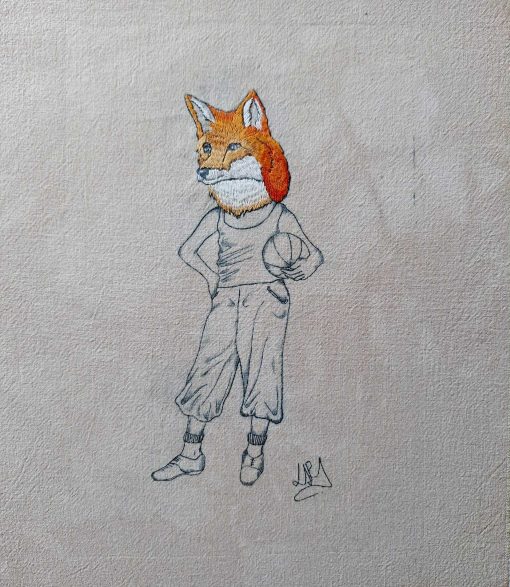 - Le renard et le ballon – Gravure à la pointe sèche imprimée sur coton teint au thè noir, brodée à la main , 40x30cm