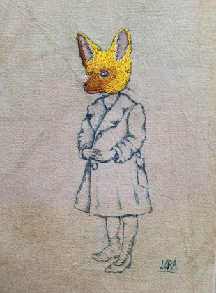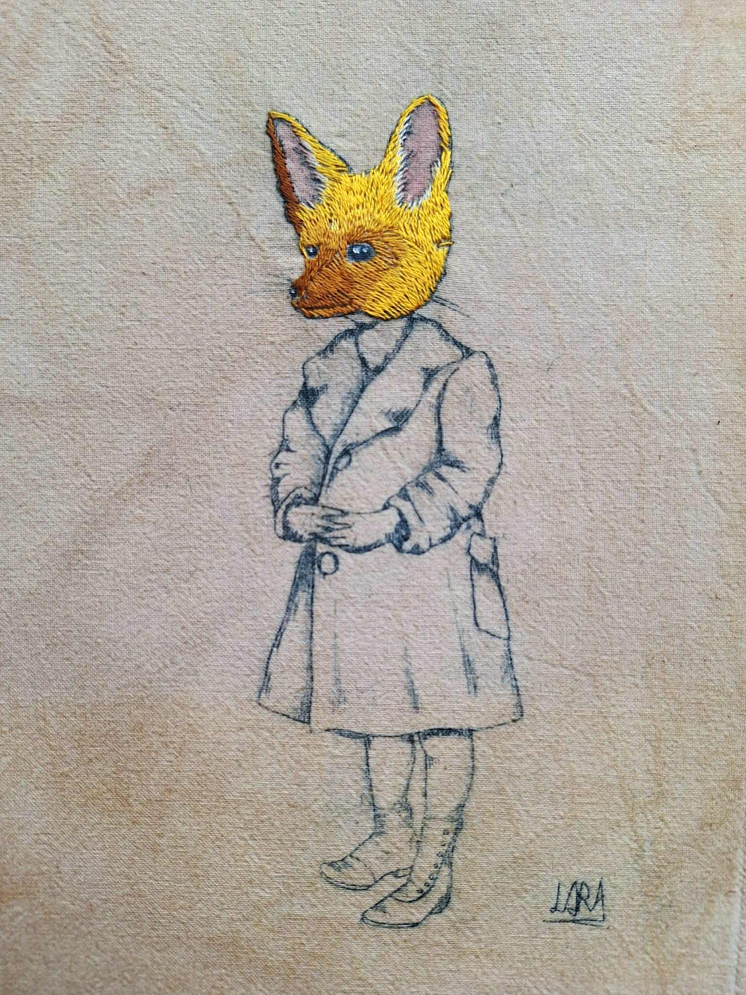 La petite fennec – Gravure à la pointe sèche imprimée sur coton teint au thè noir, brodée à la main , 40x30cm