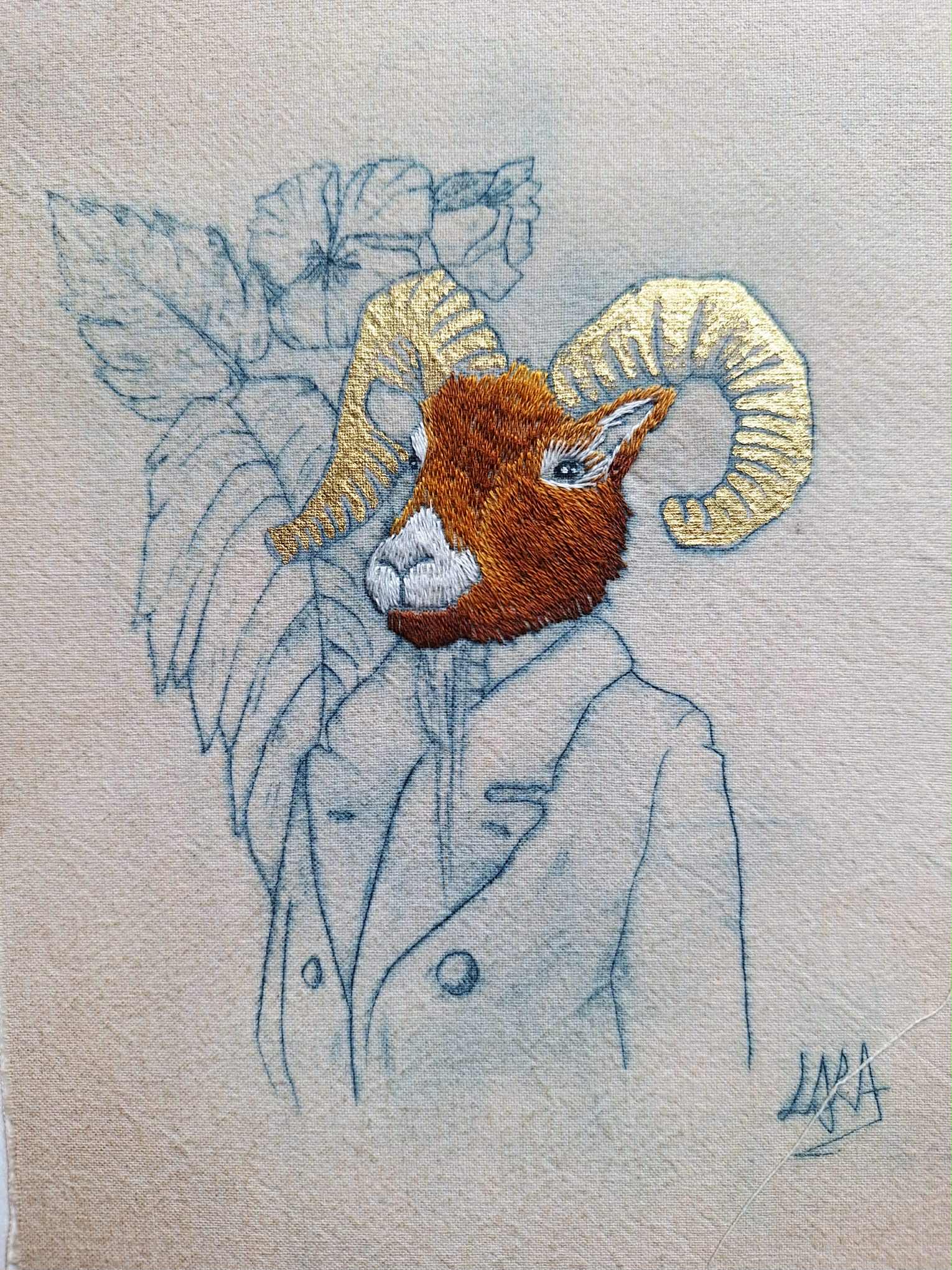 Le bouquetin Posted on août 6, 2025août 6, 2025Full size 1530 × 2040 Le bouquetin – Gravure à la pointe sèche imprimée sur coton teint au thè noir, brodée à la main + or véritable, 40x30cm